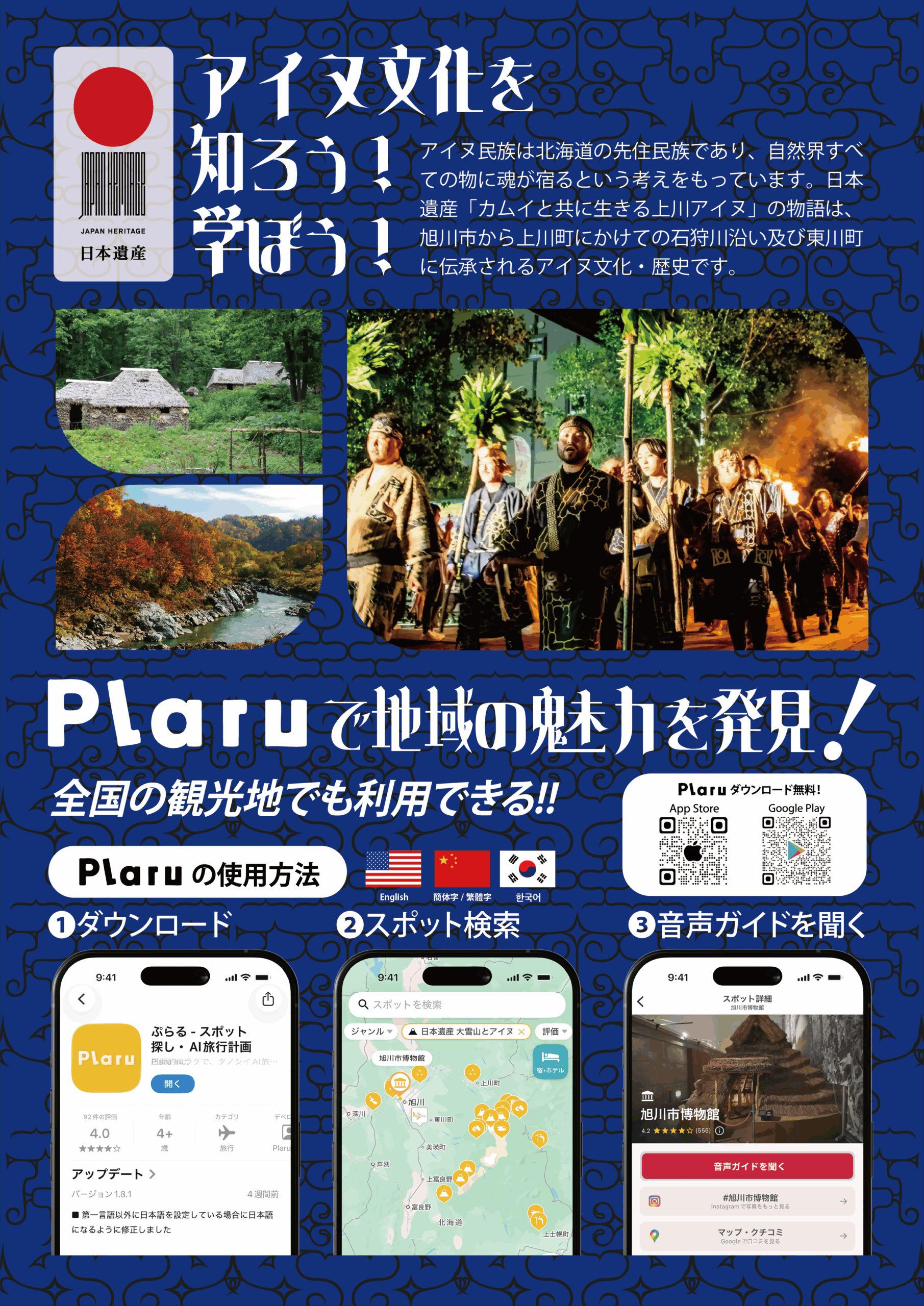 大雪山麓上川アイヌ日本遺産推進協議会(事務局:上川町)、株式会社Plaru(本社:東京都杉並区、代表取締役:大崎 雄也)およびリコーITソリューションズ株式会社(代表取締役:野水 泰之)は、観光庁が実施する「訪日外国人旅行者の受入環境整備向上等に向けた ICTサービス利活用促進事業(ICT利活用実証)」に採択されました。