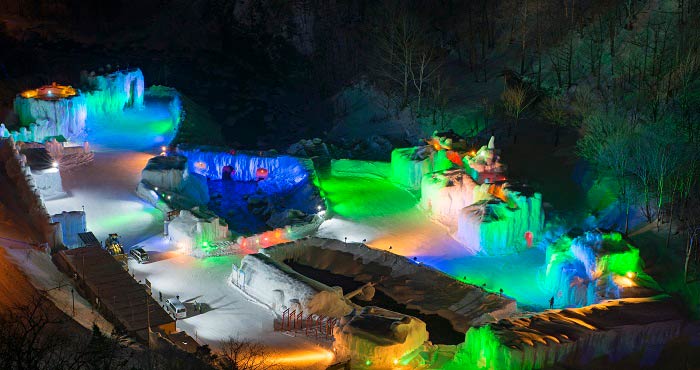 滝が凍るほどの極寒の自然を最大限に生かして作られた大小さまざまな氷のオブジェが立ち並び、ライトアップによって幻想的な光景を作り出します。