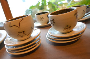 嵐山を目の前に、こじんまりとした陶房で、身近に強く生きる野辺の草花や生き物、そして雪ダルマといった北海道ならではたちをモチーフに、だれもが楽しく使える器が生み出されています。